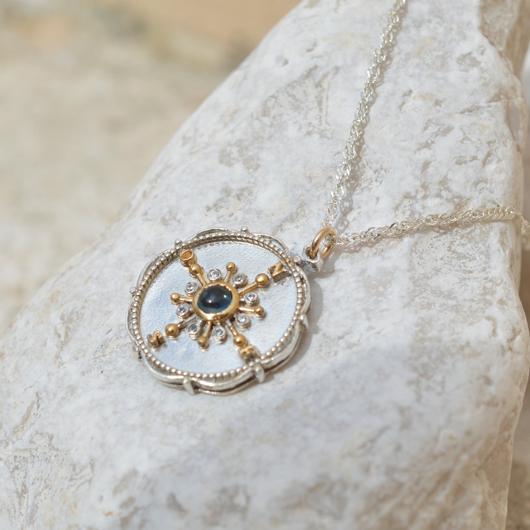 • Dije elaborado en plata .925 con recubrimiento de chapa de oro 24k, combinado con plata, piedra natural central cabujón de 5mm y pequeñas zirconias incrustadas alrededor.