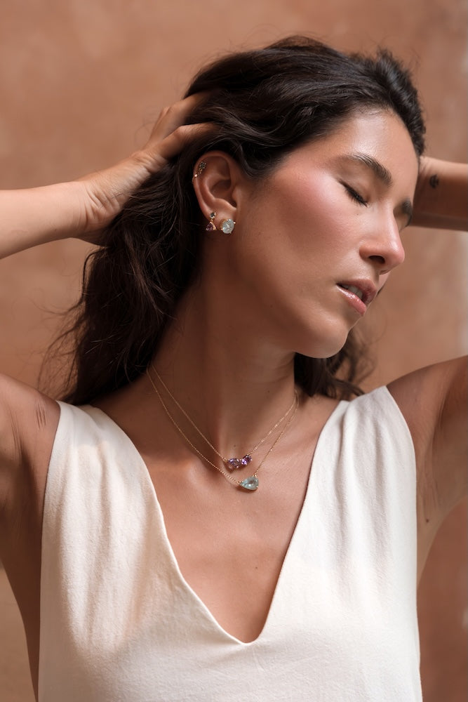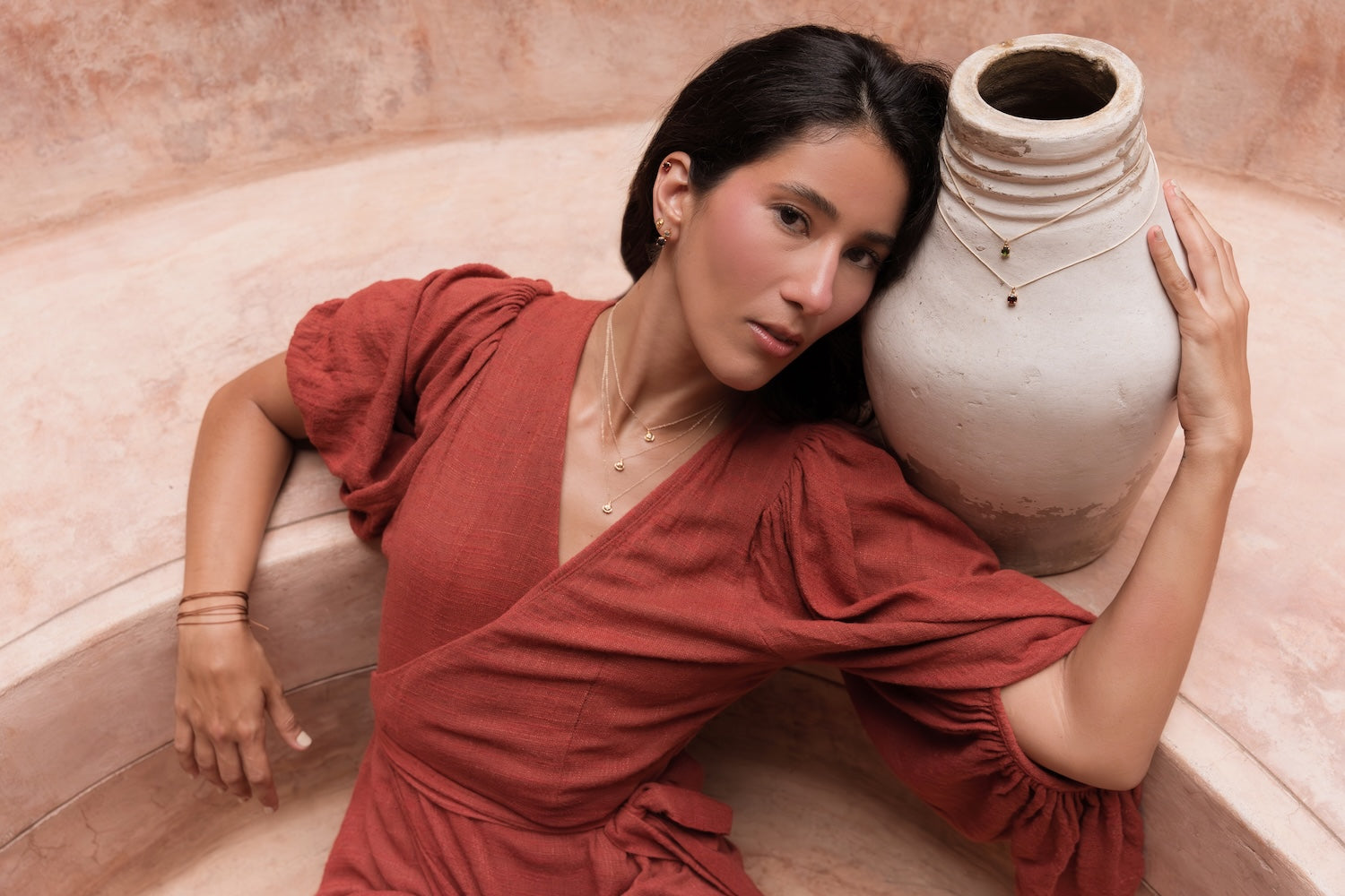 Una colección que refleja la belleza que trasciende: el brillo del oro y la energía de las gemas se entrelazan en formas puras, como círculos y triángulos, símbolos de armonía y equilibrio.