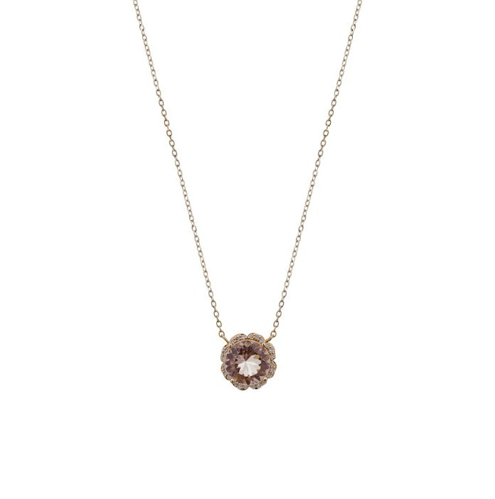 Collar flor elaborado en oro sólido rosa 14k, con morganita y diamantes naturales.