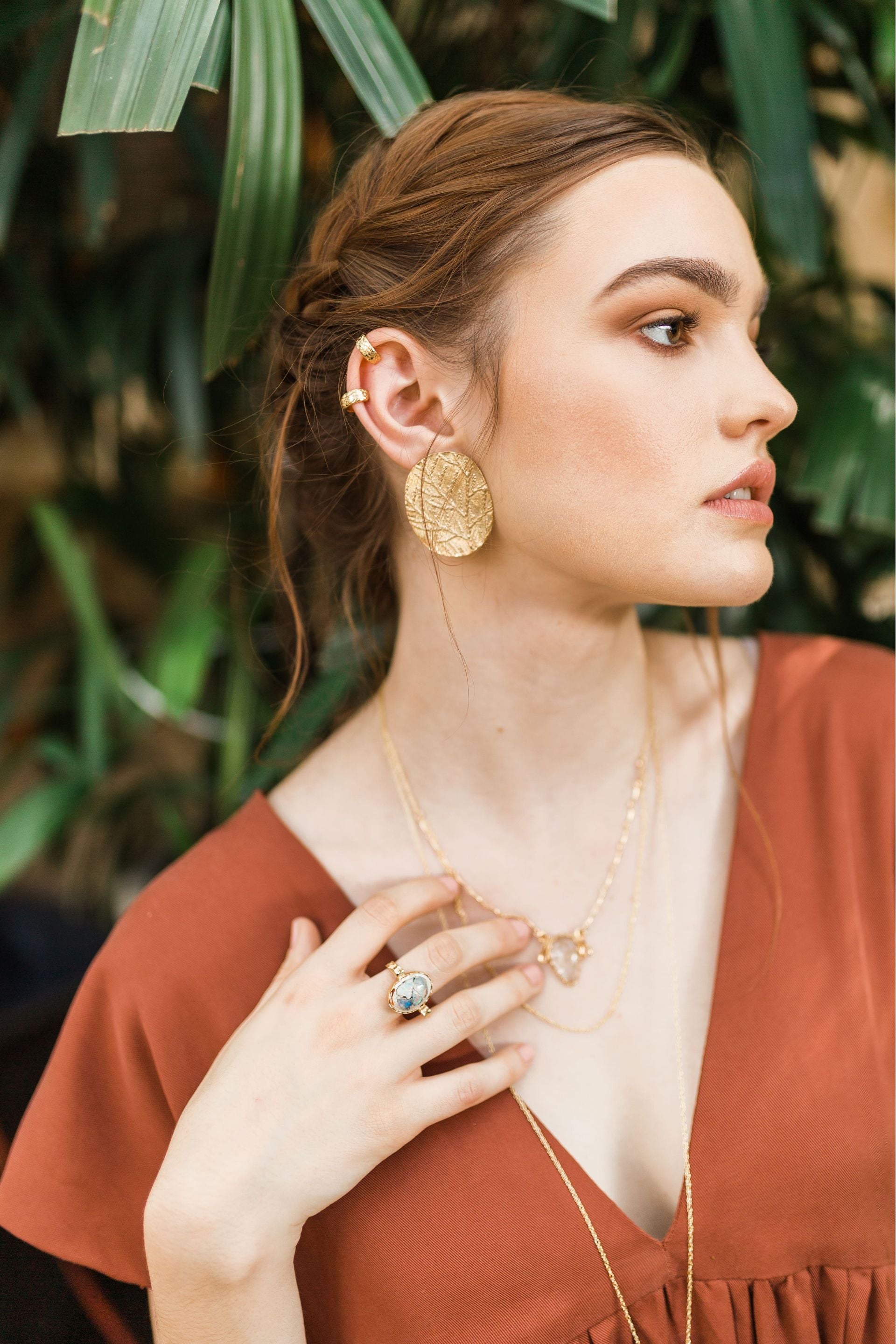 Metales puros y brillantes se convierten en joyas delicadas, con formas orgánicas y detalles únicos que transmiten elegancia y personalidad.