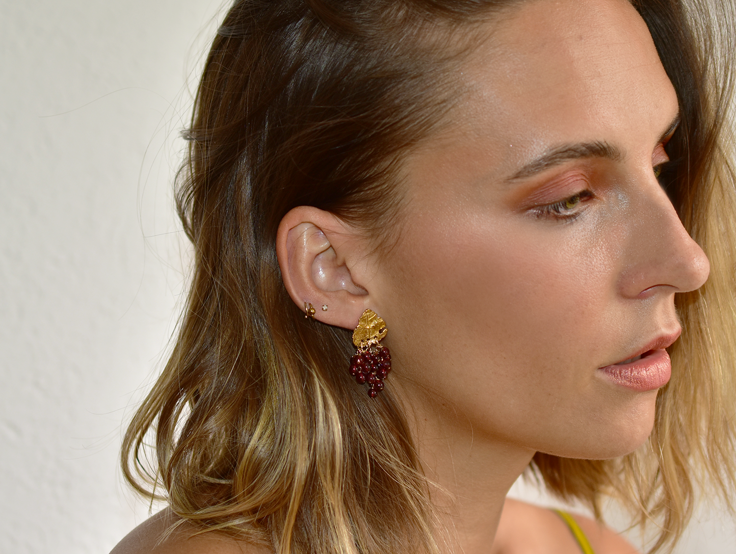 Inspirados en los racimos de uvas, cada piedra es seleccionada y engarzada con mucho cuidado y delicadeza hasta formar una pieza única y con mucho estilo. El granate, símbolo de pasión y amor propio, hará resaltar tu belleza.